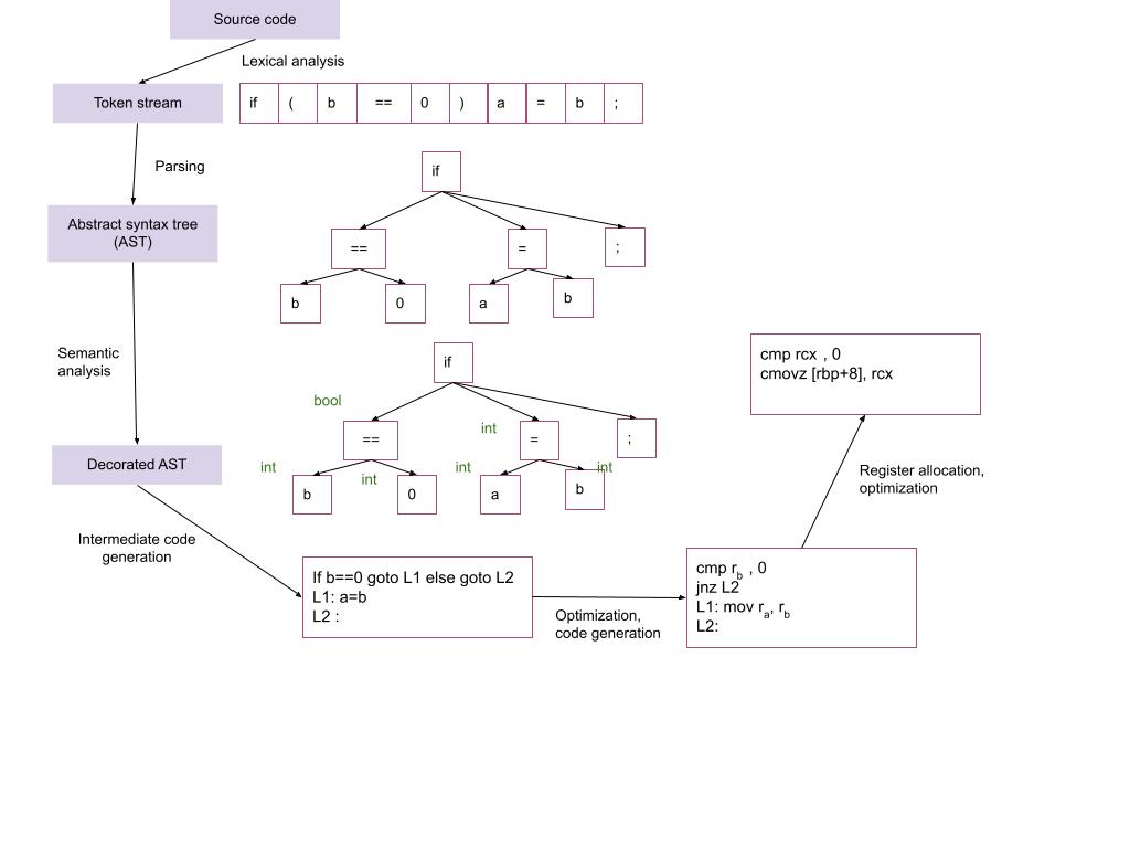 - Multi-pass Compiler: Processes the source code multiple times, improving the code pass by pass until the final pass emits the final code.