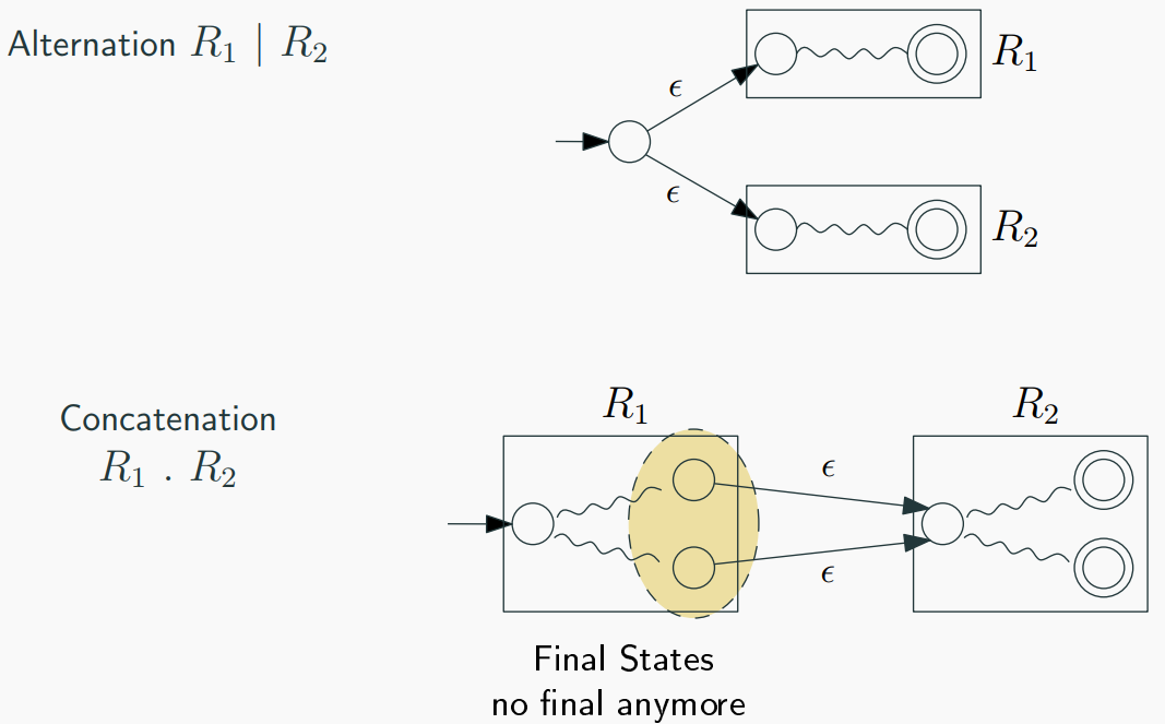 - Add a new initial state with 𝜖 transitions to the initial state of the union NFA.